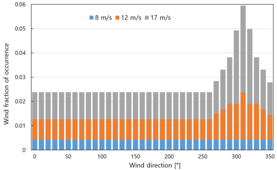 To evaluate the performance of the optimization algorithm, three wind speed scenarios were considered for the case studies, as follows: (a) the constant wind speed and single wind direction, (b) the constant wind speed and multiple wind direction, and (c) the variable wind speed and multiple wind direction. Case study (a) assumes that the wind speed of 12 m/s blows only from the north, and this can be used to confirm the basic performance of the wake model and the layout algorithm. Case study (b) is when the azimuth angle is divided into 36 sections, and the wind speed of 12 m/s is generated from all 36 wind directions with a uniform probability. Case study (c) considers 36 wind directions similar to that of case study (b) and includes three wind speeds (8, 12, and 17 m/s) with different probabilities of occurrence, as shown in Figure 4. We can see that the occurrence frequencies of 12 m/s and 17 m/s wind speed between 270 and 350° of wind direction are greater as compared to those in other directions, which means NW is the prevailing wind direction of the wind farm. Thus, wind directions between 270 and 350° have a greater effect on the wind farm layout as compared to the other directions. This condition is quite different from the wind condition of the actual wind farm, but it is used for comparing and evaluating the performance of the optimal layout algorithm.