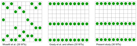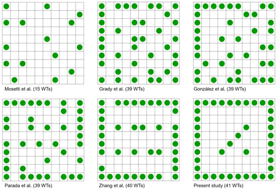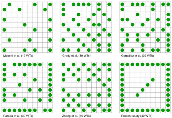 To evaluate the performance of the proposed layout optimization method based on the SA algorithm, the layout of wind turbines was performed for the three cases mentioned above, and the results were compared to those previously reported in the literature. There are several works based on this layout condition and scenarios proposed by Mosetti. However, despite showing the same layout results, the calculated values were different and the result value obtained in the present study differs as well. This can be explained due to a methodological difference in the calculation process using a wake model. However, some studies have demonstrated unreliable differences in the results. Therefore, the results of the present study were compared to those of five related studies (Mosetti et al. [3], Grady et al. [4], González et al. [8], Zhang et al. [9], and Parada et al. [19]) that provided the results within a reasonable range.