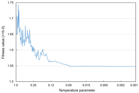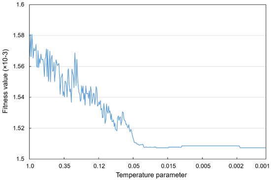 Table 2 summarizes the parameters related to the SA algorithm performance. The initial temperature was set to 1.0 and was gradually decreased by temperature control (α = 0.98) to finish the layout process, when it reached 0.001. For each temperature step, the Markov number of 200 was used to determine the number of iterations of perturbation. The setting of parameters applied to the algorithm can vary depending on the nature and difficulty of the considered problem and can be determined by empirical or preliminary performance test. The initial temperature is essentially at 1.0 and the stopping temperature is recommended to be sufficiently low; however, when the stopping temperature is too low, a considerable amount of calculation time may be required. Therefore, an appropriate value can be selected by confirming the variation of fitness through a preliminary execution of the algorithm. For example, if the fitness value advances quickly to the desired value, then the stopping temperature can be set high; otherwise, it should be set low. Alternatively, a method for stopping the execution when the desired target value is reached can also be used, and this can be done without setting a stopping temperature. The temperature control typically uses the values in the range 0.85–0.98. The Markov number determines the amount of perturbation that will be performed. Generally, it should be set to more than 100 times. If the solution search range is larger, then this value should be increased.