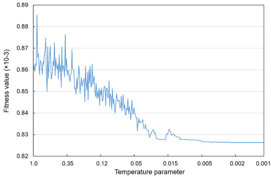 The SA algorithm is a method to simulate the metallurgical annealing process, in which the internal energy is minimized by changing the internal crystal structure of a metal, while the metal material is gradually cooled down [42]. In real metals, the repositioning of internal crystals increases the rigidity of the metal. From an algorithmic perspective, this process can be seen as finding an optimal solution in a global optimization problem. In the WFLO problem, this process can be used for determining the optimal layout result for the wind turbine by changing the position of the wind turbine. The temperature is one of the computational parameters of an SA algorithm for process iterations and probability calculations to search for the optimal solution. The optimal solution is searched for depending on the probability by varying this virtual temperature parameter [45].