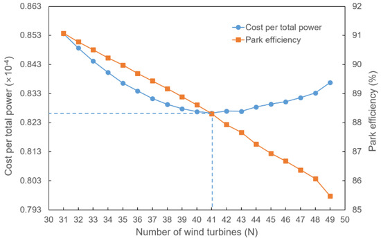 Figure 11 shows the change in cost per total power and the park efficiency of the wind farm according to the number of wind turbines in case study (c). The cost decreases as the number of wind turbines deployed increases, demonstrating the lowest value at 41 turbines, and then the cost is seen to increase. This shows that 41 is the optimal number of wind turbines for a given cost model at a given wind farm. Contrastingly, park efficiency continues to decline as the number of wind turbines increases. This is because as the turbines are added within a limited area, the wake effects between the turbines subsequently increase. However, the park efficiency is also an important factor, as a simultaneous optimal layout is needed to minimize the costs and maximize park efficiency into the future.