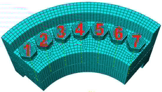 To simplify the model and reduce its overall size, a seven-bolt, 90° segment was modelled containing all of the relevant connection components to replicate a full-sized flange, including bolts, washers and nuts, as shown in Figure 2 and Table 2. This model included upper and lower flange sections, bolts, nuts and washers, as depicted in Figure 3. The dimensions of the original flange [16] are shown in Figure 3. The cross-sectional dimension of the flange was replicated in the FE model; however, small details such as the radius between the flange and the wall, as well as the angle between the flanges were neglected. As elastic interaction of the flange is important; it was ensured that the distance between the bolts was maintained between the full-scale flange and the FE model, which determined a flange diameter of 1.456 m.