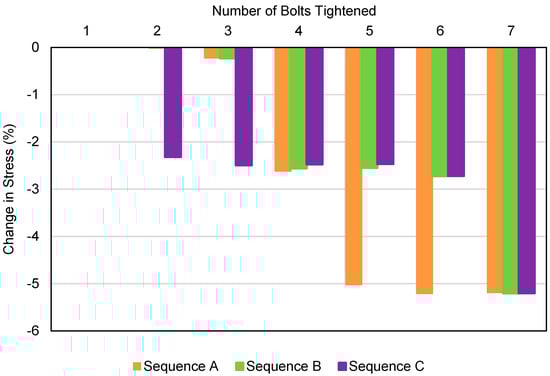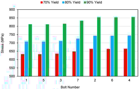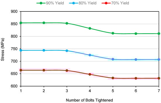 Figure 8 shows the stress data from each bolt after the completion of the tightening sequence. A similar trend was observed for all three of the Fp levels, with the first three bolts in the sequence experiencing a Fp reduction of around 5%, the fourth bolt experiencing a reduction of around 2.5% and the final three bolts experiencing little or no reduction. This is due to the number of neighbouring bolts subsequently tightened after the bolt in question and relates back to the elastic interaction of the flange. As each bolt is tightened, the flange in the immediate vicinity is compressed, causing the area around it to also be compressed. Elastic interaction is affected by the stiffness of the flange [22,23], and due to the stiffness of the flange, only the bolts which are immediate neighbours are affected. This would suggest that an increase in stiffness in the flange design would likely reduce the level of elastic interaction.