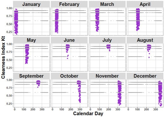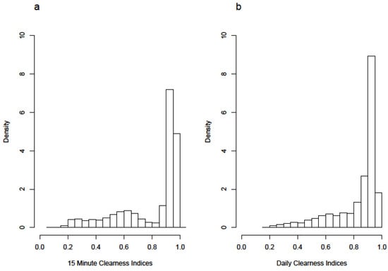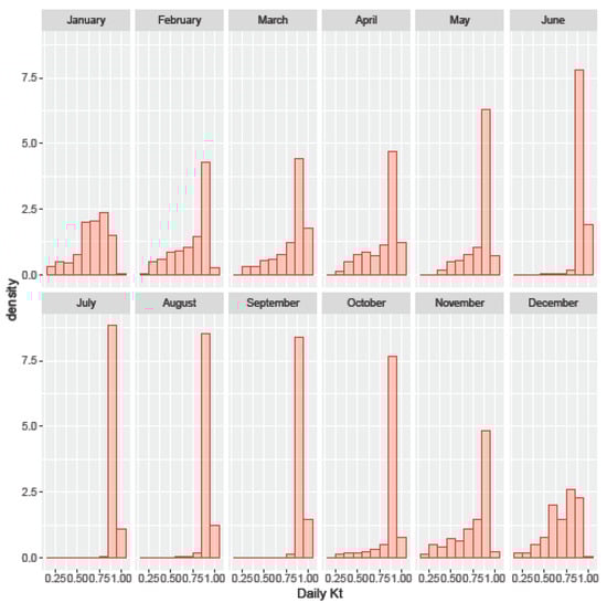 The annual distributions of the daily and subdaily clearness index (in Figure 2) demonstrate multimodal properties that are suggestive of multiple component distributions. This multimodality is more apparent for subdaily (Figure 2a) than daily data (Figure 2b). However, the subdaily data includes twilight observations at zenith angles <10° that may cause abnormal fluctuations of irradiance [56].