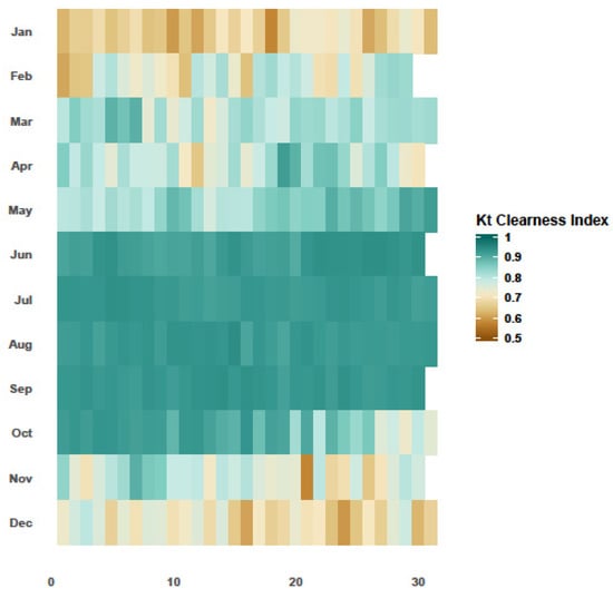 Mean Daily Clearness Indices () by day and month for the period 2005–2017.