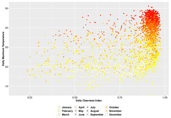 As daily maximum temperatures at the Shagaya Renewable Energy site were only available since 2012, GHCND Abraq Mazraa observations of daily maximum temperature are used as a proxy to increase the period of record for comparison with daily clearness. The correlation between daily maximum temperatures and daily clearness values is plotted in Figure 5 for 2007–2017. This supports the correlation between the highest daily temperatures and the highest values of clearness also found by [59]. Again, this result reflects the local climatology and expected seasonal pattern of higher temperatures during July and August, as well as the highest clearness values during the summer months (darker shades of red).