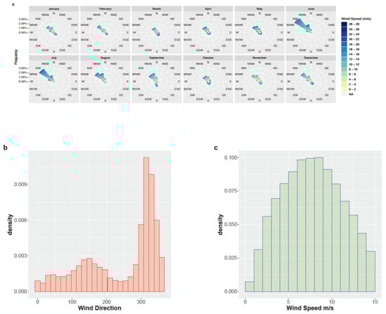 Mean annual daily wind observations from Shagaya Renewable Energy Park as: (a) wind roses of speed and direction by month; and frequency distributions of (b) wind direction and (c) wind speed.