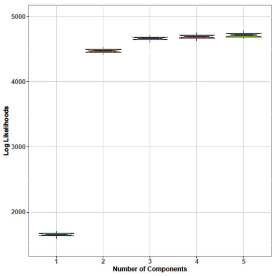 Log likelihood values for Gaussian mixture models with 1 to 5 components.