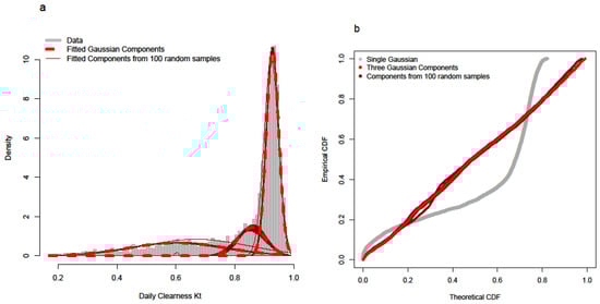 Daily Clearness indices () with three-component Gaussian mixture in red, 95% confidence intervals in dark red, and single Gaussian in grey, represented as (a) distribution densities; and (b) quantile-quantile plots.