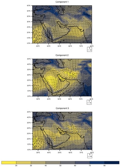 Ref. [63] characterized weather types over Saudi Arabia using the Lamb weather-type classification [67], finding that days with a cyclonic pattern followed by those with southeast directional flow are the most frequent during the summer. This behavior parallels Component 3, where the high pressure center is over Saudi Arabia, and is the most frequently occurring pattern during the summer months. It also is the component that describes the clearest days (i.e., ), as it is associated with the synoptic patterns generating less moisture and dust transport.