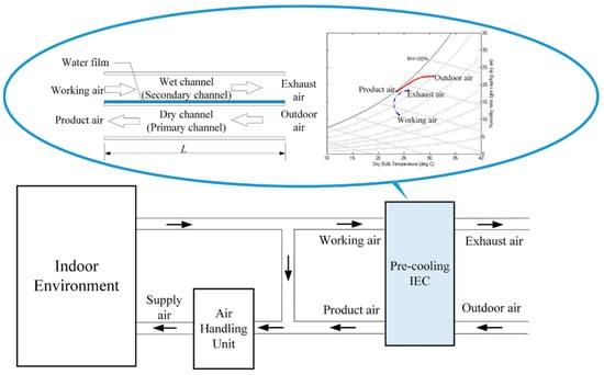 For a conventional IEC, the theoretical lowest supply temperature is limited by the wet-bulb temperature (WBT). Therefore, it is inappropriate for a stand-alone IEC to provide a desired supply air condition in humid climates as a consequence of the high ambient WBT. The IEC has been suggested to be operated as a pre-cooling unit by integrating with a conventional cooling coil [32,33]. The exhaust air from a conditioned space usually has a cooling potential which can be recovered by pre-cooling the intake air through a heat recovery unit. The IEC is able to provide an enhanced heat recovery process by employing the exhaust air as the working air. The ambient air may condense in the product channel when the interface plate temperature is lower than its dew-point temperature. The previous work focused on the process of air flowing along the wall surface with a constant wall temperature [34,35]. However, the present work investigates the humid air condensation in the IEC. The product channel interfacial boundary condition is neither a constant temperature nor a constant heat flux condition. Therefore, the heat and mass transfer in the current pre-cooling IEC is considered more complex. To the best of our knowledge, few research works have carried out an in-depth investigation on the air treatment performance of an evaporative-enhanced precooling IEC for a hybrid air conditioning system under various climate conditions. This work aims to evaluate the cooling effectiveness and the energy saving potential of a pre-cooling IEC by evaporative cooling recovery from the indoor air. We will first introduce the schematic description of the hybrid evaporative pre-cooling system, followed by the development of a mathematical formulation for the pre-cooling IEC. Thereafter, the pre-cooling performance of the IEC will be investigated for five different climate zones. In addition, simulation results are employed to estimate the energy saving potential and the cooling capacity of the pre-cooling IEC.