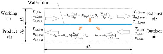 In the product channel, the heat and mass transfer process of the PA is impacted by the interfacial plate temperature. When the interface DBT () is higher than the dew point temperature of the PA (), the humidity ratio of the PA keeps constant without moisture condensation. Therefore, in this condition, the sensible cooling process occurs in the product channel resulting in a temperature decrease along the flow direction. When decreases below , the water vapor in the air starts to condense on the cold plate surface. As a result, the concentration of water vapor on the product channel surface is determined as