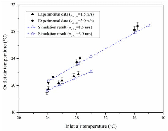 The numerical model was validated based on two experimental studies. Firstly, the simulated sensible cooling performance was compared with the experimental data for a counter-flow regenerative IEC presented in our previous published work [38]. A lab-scale IEC prototype was constructed for the experimental setup. The inlet air condition was regulated to maintain a desired steady state. The PA in the IEC was sensibly cooled without moisture condensation. The outlet air condition was measured and recorded during the experiment. Figure 3 illustrates the comparison process in terms of the outlet air DBT (dry-bulb temperature) for the IEC. The numerical simulation results showed a maximum discrepancy of about 8% for evaluating the sensible cooling process of the IEC.