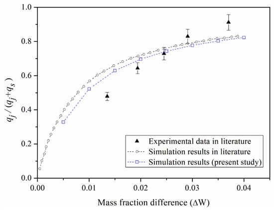 Secondly, the validation was carried out with regard to the moisture condensation from the humid air stream. The relationship between the moisture fraction and the heat flux has been investigated by previous literatures [34,35]. The present mathematical model was compared with a previous experimental study [34] and a numerical study [35] as illustrated in Figure 4. The parameters of and represents the sensible heat flux and the vapor condensation heat flux, respectively. The heat flux was determined under varying water vapor mass fraction difference (). The present mathematical model agrees well with the previous numerical study reported by Volchkov et al. [35] with an average discrepancy of around 3%. The comparison between the present model and the experimental data [34] indicates an average discrepancy of 9.7%. The reason for this violation may be attributed to the fact that the generation of liquid film on the wall surface affecting the heat and mass transfer process. The interface temperature is one of the key parameters for condensation. However, it is reported that the precise interface temperature is difficult to obtain from experimental observation. In this study, we have neglected the waviness of condensation film flow. The average discrepancy between the present mathematical model and the previous experimental data is acceptable in terms of the model’s predictability.