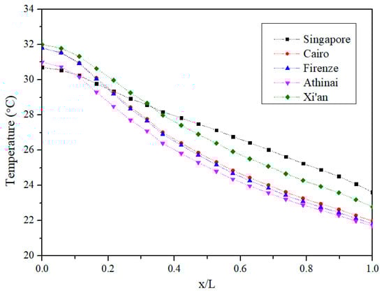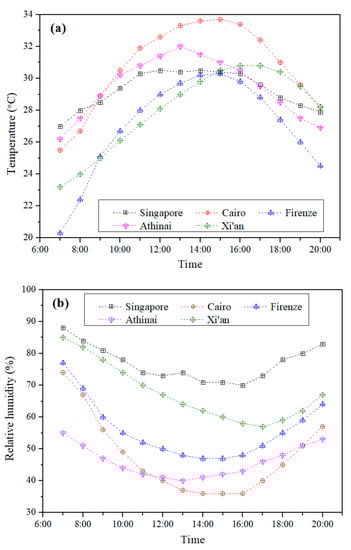 Figure 7 shows the average hourly statistics for dry bulb temperature and relative humidity of the month that the cooling design day lands on. Singapore is a city featuring a hot and humid climate. The average hourly relative humidity in Singapore is the highest among the five cities. The climate of Cairo is hot and dry with a highest average dry bulb temperature of 33.7 °C and a lowest average relative humidity of 36% at 3 pm for the cooling month of July. Firenze, Athinai, and Xi’an are the cities in the warm-humid climate zone, warm-dry climate zone, and mixed-dry climate zone, respectively.