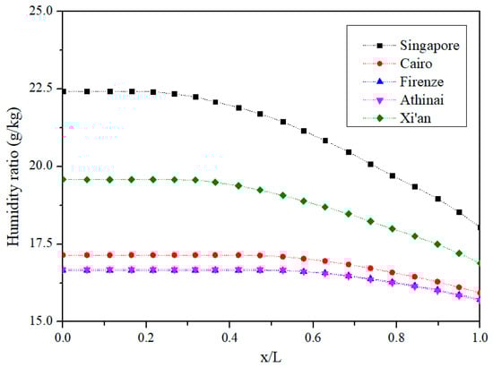 It is also observed that the wet region occupies a larger proportion for the PA with a higher inlet humidity ratio. For example, the moisture starts to condense in the channel at the location of x/L = 0.22 for the design condition of Singapore, while the wet region starts at the location of x/L = 0.58 for the climate of Athinai. In other words, the pre-cooling IEC shows a larger latent cooling capacity for humid climates.
