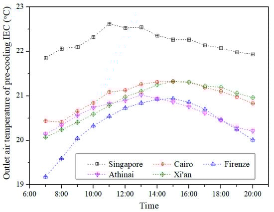 In Singapore, the pre-cooling IEC obtains the highest outlet temperature as a result of the humid climate. The outlet temperature of the pre-cooled PA ranges from 21.9 °C to 22.6 °C. On average, the is around 2.5 °C lower than the . Therefore, the PA is pre-cooled and dehumidified by the IEC throughout the day under the humid tropical climate. In Cairo, the pre-cooling IEC is able to effectively reduce the PA dry bulb temperature since the ambient climate is hot and dry. The pre-cooling IEC purely provides the sensible cooling since the is higher than the . Compared with the variation of in Cairo, the similar profiles are also observed in Firenze and Athinai as shown in Figure 8 and Figure 9. In Xi’an, the average hourly ambient dew point temperature ranges from 20.4 °C to 21.3 °C during the daytime. It can be seen from Figure 8 that the pre-cooling IEC is capable of reducing the dry bulb temperature of the pre-cooled PA below the ambient dew point temperature.