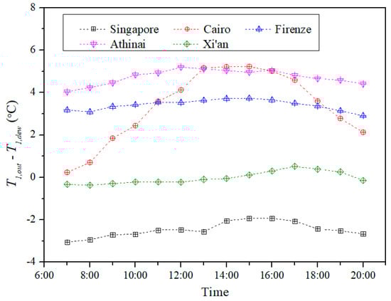 The simulation has been carried out to investigate the air treatment process of the pre-cooling IEC in cooling seasons for the selected cities. Figure 8 presents the variation of the average hourly outlet PA temperature of the pre-cooling IEC. In general, the outlet pre-cooling temperature shows a similar trend to the profile of the hourly ambient dry bulb temperature. To further illustrate the latent cooling performance, Figure 9 compares the difference between the dry bulb temperature of the outlet PA and the dew point temperature of the inlet PA (namely, ). The moisture condensation process is triggered when the temperature of PA is lower than the value of . Therefore, the temperature difference () in Figure 9 can be employed as an index for evaluating whether the latent cooling has occurred.