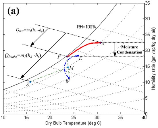 As shown in Figure 10, the enthalpy of the ambient air can be reduced from to by passing through the IEC. The cooling capacity of the IEC () can be determined based on the enthalpy difference. On the other hand, the total cooling load for conditioning the intake ambient air () is calculated according to the enthalpy difference between point A and point S.