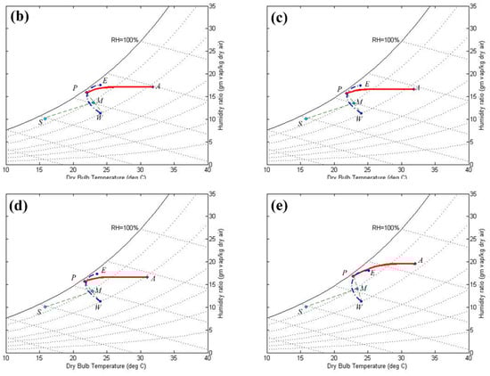 Description of air conditions on psychrometric chart for the hybrid system operating under the design conditions of (a) Singapore, (b) Cairo, (c) Firenze, (d) Athinai, and (e) Xi’an.