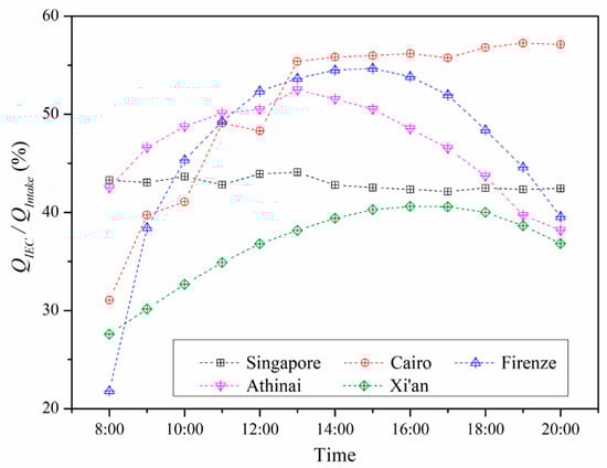 It can be seen from Figure 11 that the IEC is able to effectively fulfill part of the cooling load of the ambient intake air. In Singapore, the IEC pre-cooling capacity shows a small variation during the daytime with an average percentage of 43%. In Cairo, the IEC has a highest pre-cooling capacity percentage of up to 57%. It demonstrates that the IEC obtains a better pre-cooling performance in hot and dry climate. For the warm climate zone, such as Firenze and Athinai, the percentage of IEC pre-cooling capacity generally presents a higher value compared with the performance in Singapore with the humid climate. In Firenze and Athinai, the average IEC pre-cooling capacity percentage is around 47%. In Xi’an, the percentage spans 28% to 41% for the average ambient climate condition.