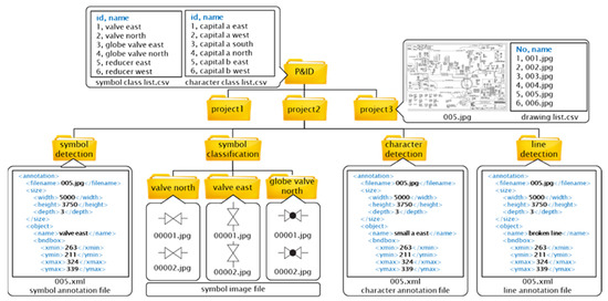 Figure 1 illustrates the training data structure used for the P&ID recognition deep learning model. The P&ID folder is the layer on top of the folder. It consists of the files containing the lists of symbol and character classes. The symbol class includes the symbol type and orientation as well as character class, count, size, and orientation. Projector folders are placed under the P&ID folder layer. Training data are generally stored at the project unit because each project uses its own symbols and legend. A project folder, thus, stores files containing the list of the diagrams created in that project and actual image format diagrams.