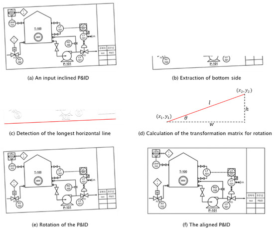 To realign the inclined P&IDs (Figure 2a), the degree of inclination or tilt angle must be measured. Given that the longer the straight line used for the angle calculation, the smaller the angle calculation error is, the horizontal line of the outer border, which is the longest line of a diagram at the outer boundary, is used for calculating the rotation angle. To identify the outer border horizontal line, the bottom one-fifth of the diagram is cut out as shown in Figure 2b, in which the longest horizontal line is identified as shown in Figure 2c. A detailed method for horizontal line recognition is described in Section 5.3. The inclined angle, as shown in Figure 2d, can be calculated using an arc-sine function after obtaining the coordinates of both ends of the longest horizontal line of the diagram. After calculating its inclined angle, the diagram is realigned by image rotation, as shown in Figure 2e. The inclined angle is calculated using Equation (1).