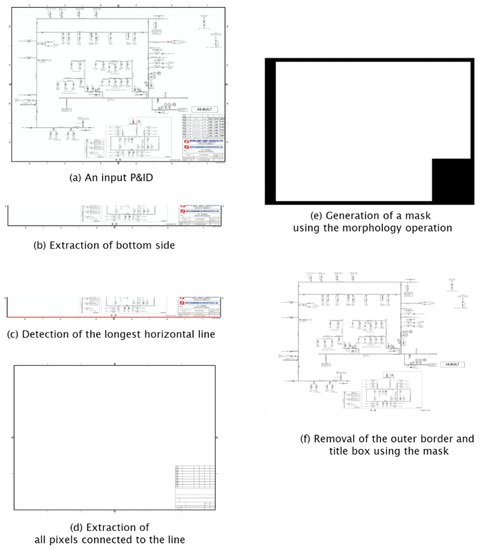Figure 3 illustrates the border and title box removal process. After cutting out the bottom one-fifth of a diagram (Figure 3b), all horizontal lines on this part of the diagram are clipped out. Among the extracted horizontal lines, the longest line is selected, and the second longest line is also selected if the length error is within a 5% range (Figure 3c). Once a horizontal line is selected, all lines connected to this line are identified by detecting all the black pixels on the diagram image connected to the line (Figure 3d). Since a title box is connected to the outer border, the title box can be identified by extracting the black pixels on the image corresponding to the outer border. A morphology operation is then applied to the extracted black pixels to identify the outer border and title box (Figure 3e). Lastly, the identified areas are removed from the P&ID image (Figure 3f).