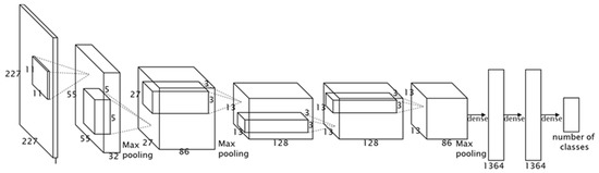 A new deep learning model for symbol image classification is defined based on AlexNet [14]. AlexNet is a CNN model that won the 2012 ImageNet Large Scale Visual Recognition Challenge (ILSVRC) for classifying an image with 1000 classes. This model consists of eight layers, and its recognition accuracy is lower than those of GoogLeNet [15], VGGNet [31], and ResNet [32], which have more than 20 layers. However, considering the limited volume of data in the engineering sector compared with other fields where thousands of pages of training data are available, we defined the deep learning model for symbol image classification based on AlexNet, which can be trained with a relatively small amount of data.