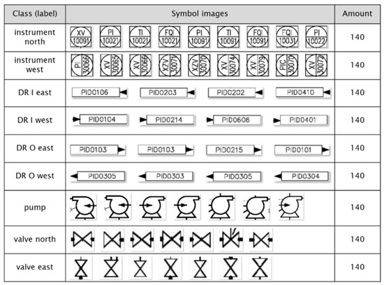 For this study, four types of symbols were selected: pump, instrument, valve, and diagram reference (DR). Considering the possible symbol alignment orientations on the diagram, the recognition objects were categorized into nine classes: pump, DR I (inlet) east, DR I west, DR O (outlet) east, DR O west, instrument north, instrument west, valve north, and valve east. The reason for selecting these particular types of symbols is the largely varying morphology, size, and aspect ratio of each of these symbols and the importance of their accurate recognition for the success of the proposed deep learning model through training data expansion.