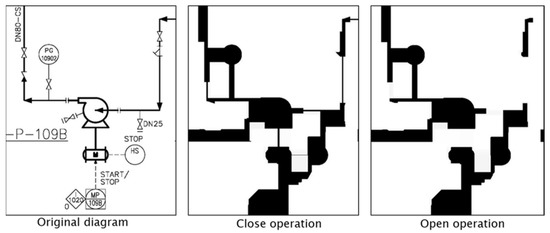 For instance, if the prediction value for a given image to be classified as the pump class is 23, then the normalized value will be 0.74 because the maximum predicted value of the pump class is 31.13. In the in-image object detection method using a sliding window, image classification was performed, while a window with a specific size slid over all the pixels inside an image. However, an image with a high resolution, such as 5000 × 3000, inevitably takes a longer operation time. To address this problem, candidate areas likely to have symbols were identified in a high-resolution diagram, and a sliding window was applied to those areas, which reduced the amount of operation required. Especially, to identify an area containing a symbol in a P&ID drawing, a close morphological operation was performed and the empty spaces inside the symbol were filled, which was followed by an open morphological operation to remove elements such as piping. Figure 6 illustrates the results of the symbol area detection.