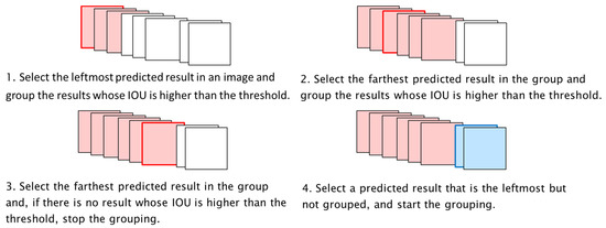 In the grouping process, the leftmost prediction result in the diagram was detected and grouped together with the adjacent ones. The adjacent prediction results are defined as those with an IOU greater than or equal to a predefined threshold value (i.e., 0.3). After the prediction result farthest from the first selected prediction result in the group has been selected, the process is iterated until there is no adjacent prediction result left in that group. After the grouping process of a group has been terminated, the whole process is applied to the next ungrouped prediction results and is iterated until there are no more ungrouped prediction results left.
