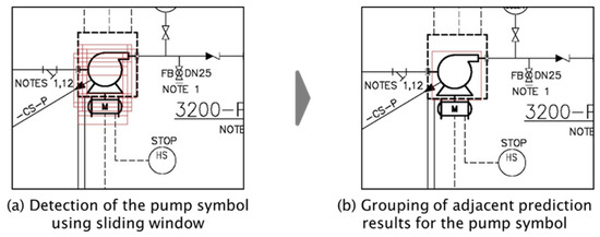 The method of grouping the adjacent prediction results was verified by applying a sliding window to detect the pump symbol in the P&ID and performing the grouping of prediction results, as shown in Figure 8.