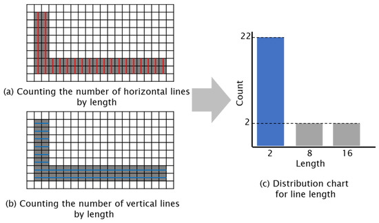 Figure 9 depicts the method to identify the thickness of lines frequently used in a P&ID. The number of connected black pixels was recorded while moving pixel by pixel from the leftmost one toward the right-hand side of the image. Likewise, the number of connected black pixels was recorded while moving pixel by pixel from the topmost pixel toward the bottom of the image. Lastly, the two records were combined and the distribution of the pixel count over length was calculated. Since a considerable portion of the line objects constituting the P&ID were continuous lines (pipelines) or dotted lines (signal lines), the approximate thicknesses of the continuous and dotted lines could be determined by checking the pixel length that occupied the largest proportion in the pixel length distribution.