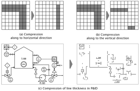 Figure 10 illustrates the method to compress the thickness of the lines in the P&ID to one pixel. First, the kernel for line thickness compression was defined. When (x, y) is the coordinate of the target pixel, a 1 × 2 kernel makes the target pixel white if the (x + 1, y) pixel is black. By applying the 1 × 2 kernel to all pixels of a P&ID image, horizontal lines are eliminated, and an image with a line thickness of one pixel can be obtained with the remaining lines. When (x, y) is the coordinate of the target pixel, a 2 × 1 kernel makes the target pixel white if the (x, y + 1) pixel is black. By applying the 2 × 1 kernel to all pixels of a P&ID image, horizontal lines are eliminated and an image with a line thickness of one pixel can be obtained with the remaining lines.