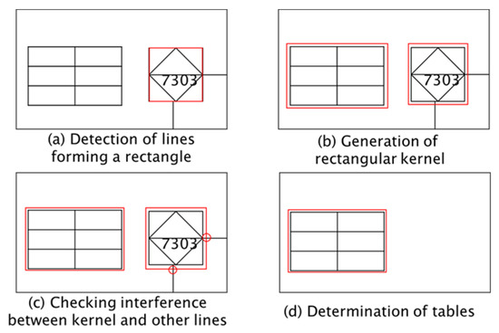 The method to recognize a table in a P&ID is presented in Figure 11. The first step is to identify the line combinations that form a table based on the same starting and ending points of those lines when connected in the vertical and horizontal directions (Figure 11a). The second step is to generate a rectangular kernel with the identified line combinations, setting the line thickness to three times the thickness of the P&ID lines (Figure 11b) and checking whether there are lines protruding from the generated kernel and connected to other elements in the diagram (Figure 11c). Lastly, the identified line combination with no line connected to any outside element is defined as a table (Figure 11d).