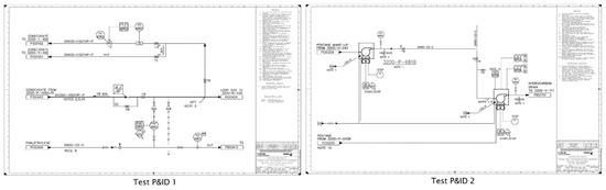 Two test P&IDs are prepared for the experiments, as shown in Figure 12. They are modelled by referring to P&IDs provided by ‘S’ engineering company in Korea. Test P&IDs 1 and 2 have resolutions of 1460 × 840 and 1360 × 780, respectively.