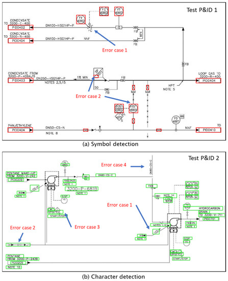 The symbol misidentification rate was 23.6% on average. The character misidentification rate was 19.2% on average. The line misidentification rate was 12.1%. The symbol recognition result revealed that symbols of a specific type were identified as an incorrect type (false positives) (error case 2 of Figure 13a). This problem can be solved by increasing the type and amount of training data and reinforcing the layers of the image-classification deep learning model accordingly. The character recognition result revealed that a symbol was recognized as a character (error case 2 of Figure 13b). This problem of multiple false positives can be solved by further training the CTPN using the character data extracted from the P&ID and modifying the CTPN model, considering the specificity of character strings included in P&ID. Regarding the line recognition result, several character strings were identified incorrectly as lines (error case 2 of Figure 13c).
