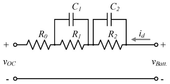 The EEC battery model is shown in Figure 1, and according to references [,,,], this representation describes the internal electrochemical phenomena of the battery, which is based on its construction. In this equivalent model, represents the battery open-circuit voltage, represents the bulk electrolyte resistance, also known as the internal resistance or ohmic resistance. The constant-phase element is given by the capacitor and resistor , which are used to model the distribution of reactivity representing the electrode properties. Charge transfer resistance and double-layer capacitor represent the interfacial impedance of the cell. and are the battery current and voltage, respectively.