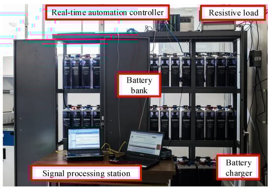 Figure 2 shows the test bench, where a real-time automation controller (RTAC) is used []. The RTAC has voltage and temperature sensors to monitor battery voltages and temperatures. The battery temperature was measured on the negative terminal. The current transducer was adapted on the RTAC to monitor the string current. An 8514 programmable DC electronic load and an AT10.1 charger were used. Two relays to switch the charger and the testing load were adapted to the digital outputs of the RTAC. A laptop was used to configure the RTAC and processing data.