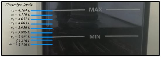 Only the values of are needed to detect the low level of electrolytes. The obtained values of the 44 VLA batteries are listed in Table A2 (see Appendix B). Please notice that is always the biggest as compared with the subset in all cases. Also, Figure 6 shows the variation of internal resistance according to eight electrolyte levels for the first ten batteries. Figure 6 shows the electrolyte levels and the scale in liters at the top and bottom axes, respectively.