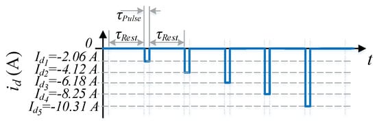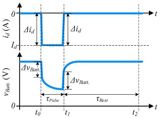 Parameter is estimated as follows [,,,,,]: firstly, a discharge pulse of constant current amplitude () is applied from to during 10 s ( = 10 s), as shown in Figure 4. Battery voltages, and string current measurements from to are recorded and, of each battery is estimated by Equation (1). We should mention that and are obtained in the linear segment of the transients to avoid capturing the charge transfer phenomenon and inaccurate estimation.