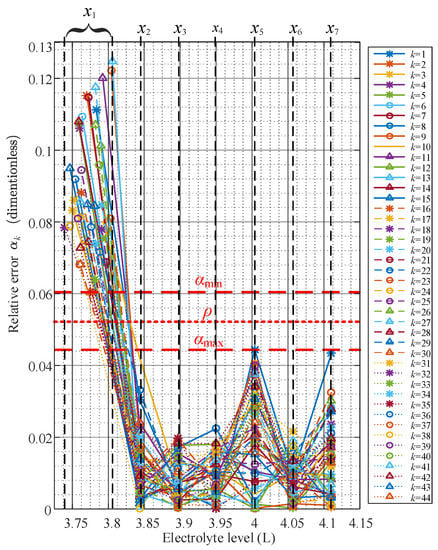 According to Equation (6), the proposed relative error means the normalized error of respect to the its cumulative moving average value (). This is to say, if the is constant for all electrolyte level, is zero. In regards with the study case, Figure 7 shows of all batteries.