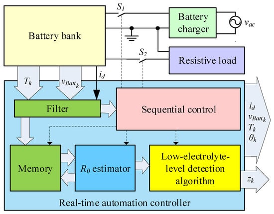 Figure 8 illustrates the block diagram of the implemented system, where is the measured temperature of the k-th battery, is the measured voltage of the k-th battery, is the string current, and and are relays to control the battery charger and the load. The outputs are the voltage, the current and the temperature, the average value of the internal resistance of the k-th battery, and the bits used to indicate the detection of the low electrolyte level for the k-th battery.