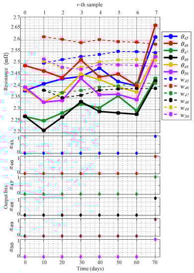 Figure 9 shows experimentally obtained results , , and . The continuous lines plot , the dashed lines represent , and the dots depict the output bits , for batteries from k = 45 to k = 50. The experimental results validate the low electrolyte level criterion successfully even though the full validation experiment took 70 days, and the characterization process only lasted eight days.