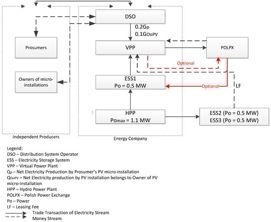 The idea of the VPP is based on the physical cooperation with such partners as prosumers and other owners of renewable-energy sources, an independent distribution system operator (DSO), and an ESS owner. Figure 2 presents the main partners of the VPP, and the physical (energy) and financial streams between them. One of the energy-storage batteries (creating the ESS) and the hydrogenerators belong to the energy company, but the VPP must partially contribute to their costs. ESS1 was cofunded from an EU fund. The other two energy-storage batteries (ESS2 and ESS3) were leased from an independent energy company. Costs depend on generator age and financial sources. The capacity of each energy-storage battery equals 0.5 MWh, and power totals 0.5 MW. It can be discharged to up to 90% of the maximum capacity, and the maximum number of cycles is 5000 for an 80% level of discharge.