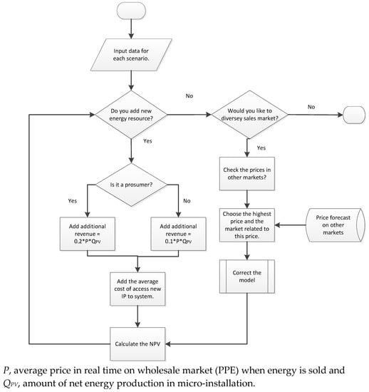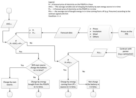 The most important factors influencing NPV (revenue, cost) are electricity price, number of IPs, weather (dry or sunny summer), and ESS charging and discharging. The VPP could only influence ESS work and acquire new IPs (prosumers and owners of micro-installations). It is possible to diversify the sales market, but in the presented simple model there is only one market segment, POLPX. The presented decision model is linked with a short-run decision, but NPV calculation is made on the basis of a long-run assumption. Error of the embedded mathematical algorithm in the VPP IT system, which makes short-run decisions, has a significant influence on the financial result of the VPP over a long period of time. The decision process connected with charging and discharging the ESS (Figure 4) is complementary to the main decision process of the VPP. Additionally, there is the possibility of charging the battery with energy coming from micro-installations belonging to the IPs (Figure 4).