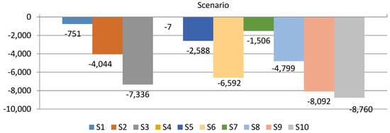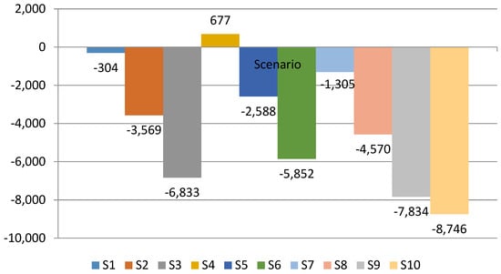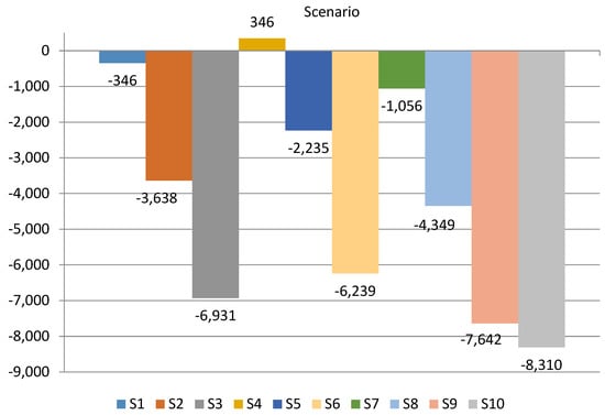 If the analyzed independent variables increase by 10% in relation to basic volume of this variable (xB), new calculated NPVs are higher (Table 4) than the base NPVs for S1, S2, S3, and S10, as presented in Figure 5.