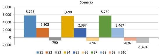 The rate of change of each independent variable was 10%. Elasticity of was separately calculated for each scenario, namely, S1, S2, and S3. Additionally, the price-elasticity index was estimated for S10. The NPV output values are shown in Table 4. The NPV output value is the simulation effect when independent variables increase by 10%. Table 5 presents elasticity indices for each variable and the analyzed scenarios.