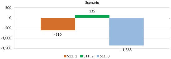 The answer to the last, but not least important, question (Figure 9) creates three scenarios if battery capacity is 1 MWh, power is 1 MW, and it belongs to the energy company, cofunded by the EU grant. Scenario S11_1 is for typical weather conditions, S11_2 for a year with rainy summer, and S11_3 for a dry and sunny one. The NPV results were much better than those in analogous scenarios S2, S5, and S8, respectively.